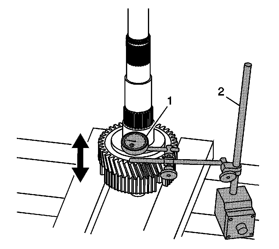5. Using J 8001-3 or J 26900-12 (1) and J 26900-13 (2), measure the 3rd gear axial play.
