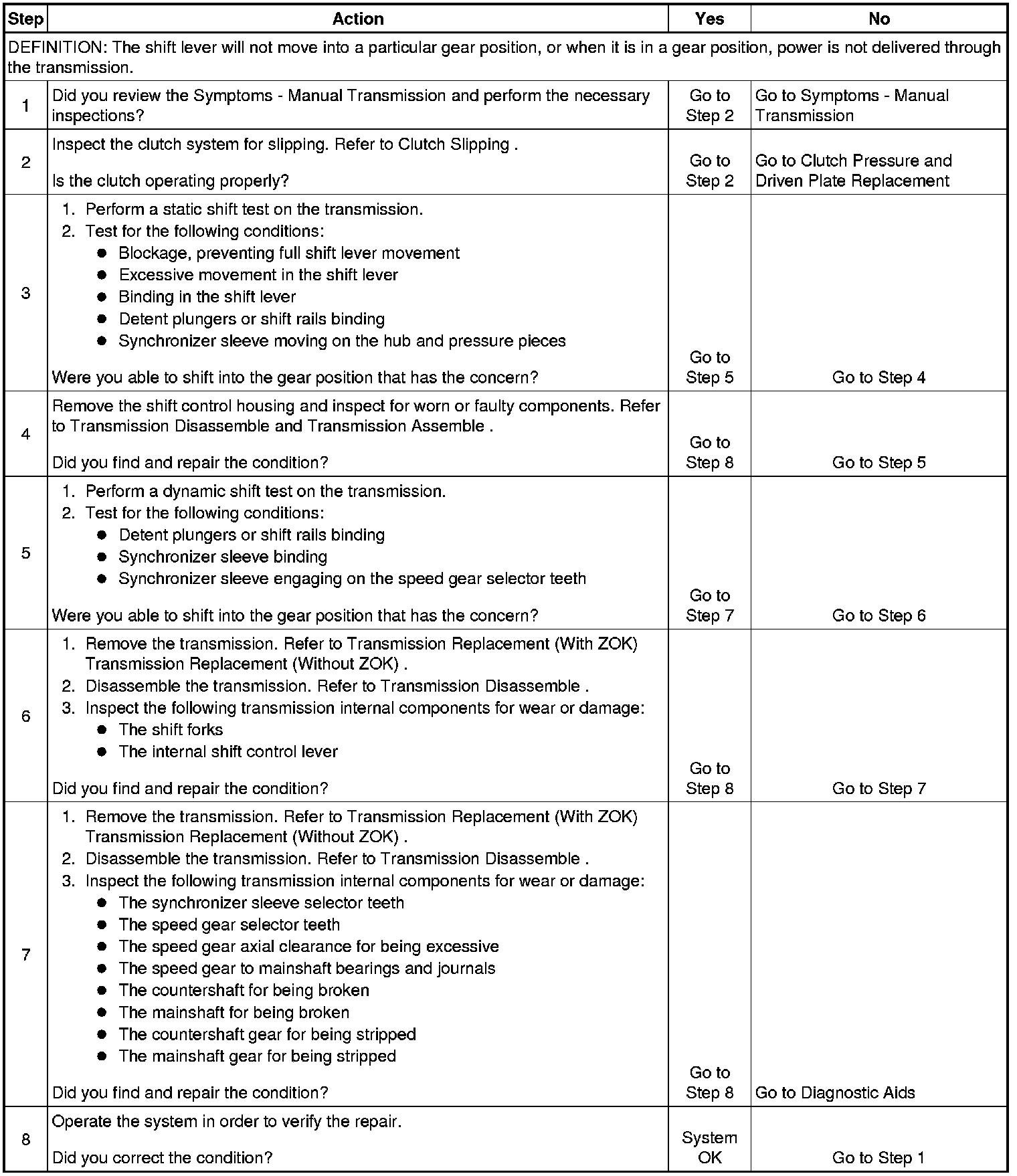 If the transmission shifts into gear and then jumps out of gear, refer to Transmission Jumps Out of Gear (Transmission Jumps Out of Gear). If the vehicle is equipped with a transfer case, during certain load conditions, the transfer case may fail. If it is an intermittent condition, other driveline components may be faulty.