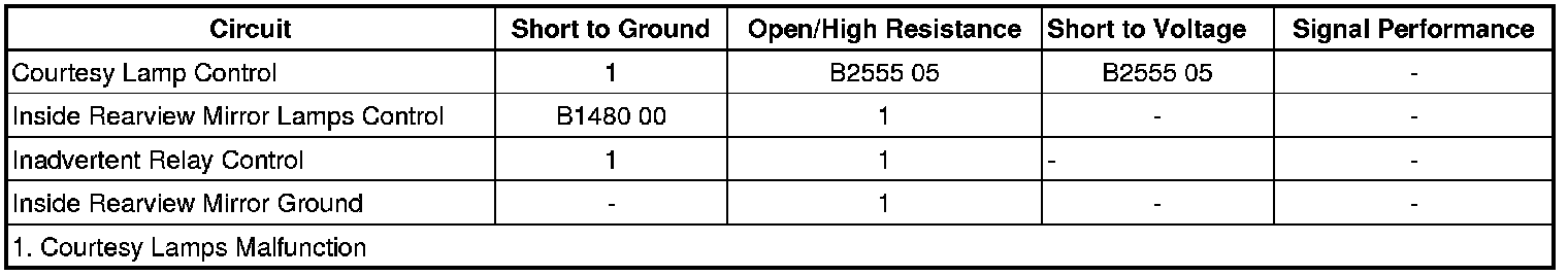 DTC B1480 will set when the courtesy lamps voltage supply circuit is shorted to ground for 1 second or greater.