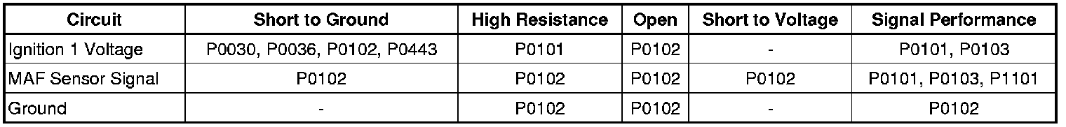 * A steady or intermittent high resistance of 15 ohms or greater on the ignition 1 voltage circuit will cause the MAF sensor signal to be increased by as much as 60 g/s.