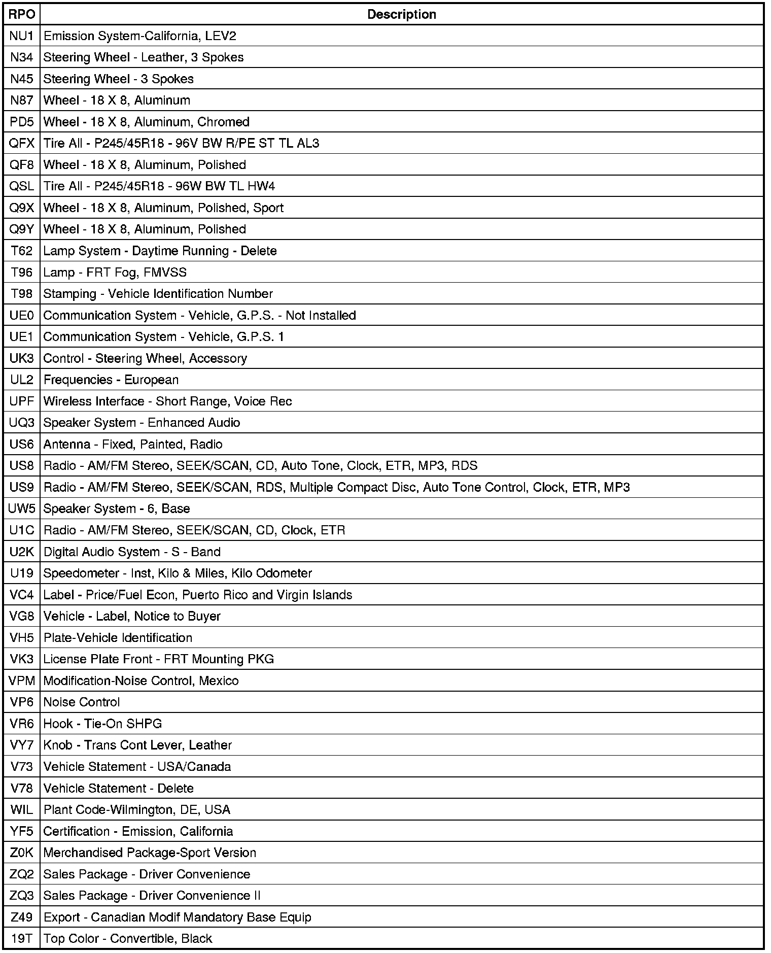 The following table provides the description of the Regular Production Option (RPO) codes that are available on the vehicle. The vehicle RPO list is printed on the Service Parts Identification Label.
