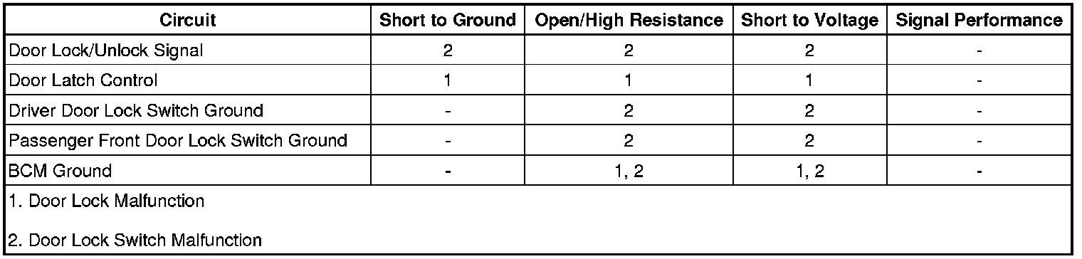 The dr lck fuse supplies battery positive voltage to the body control module (BCM) for the door lock system. The BCM supplies and monitors a reference voltage to the door lock switch through the door lock switch lock/unlock signal circuit. The door lock switch also receives a constant ground source. If a door lock switch is placed in the lock position, the reference voltage is taken directly to ground and the BCM detects the voltage drop on the signal circuit. If a door lock switch is placed in the unlock position, the reference voltage is taken to ground through a 1.5k ohm resistor that is internal to the door lock switches and senses approximately 2.9 volts on the signal circuit. This is how the BCM determines what portion of the door lock switch was activated. The BCM, upon receipt of a door lock switch lock or unlock signal, will switch the appropriate door lock actuator control circuits to battery positive voltage. The opposing side of the door lock actuators are connected to ground internally within the BCM through the other door lock actuator control circuit and the doors will lock or unlock appropriately. Vehicles without keyless entry have 2 internal drivers in the BCM to control the door lock actuators. All door lock and all door unlock. Vehicles equipped with keyless entry have 3 internal drivers in the BCM. Driver door unlock, passenger door unlock and all door lock. This is done to isolate the driver door lock actuator so it can be unlocked by itself using the keyless entry transmitter.