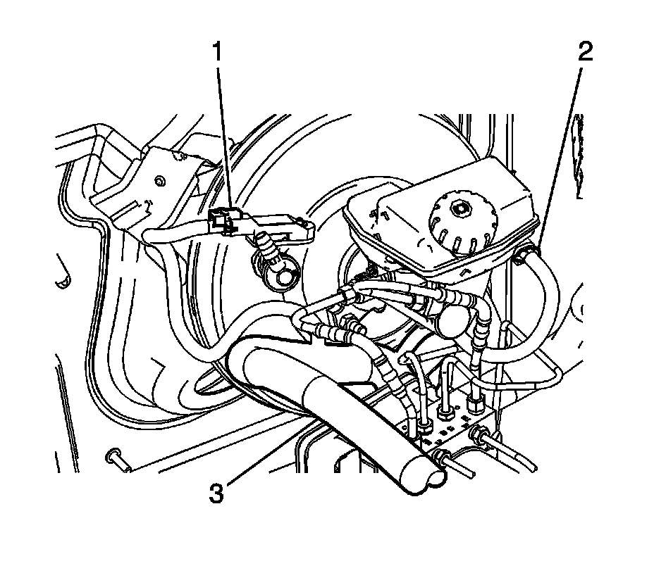 7. Install the engine wiring harness (3) retaining clip to the master cylinder mounting stud.
