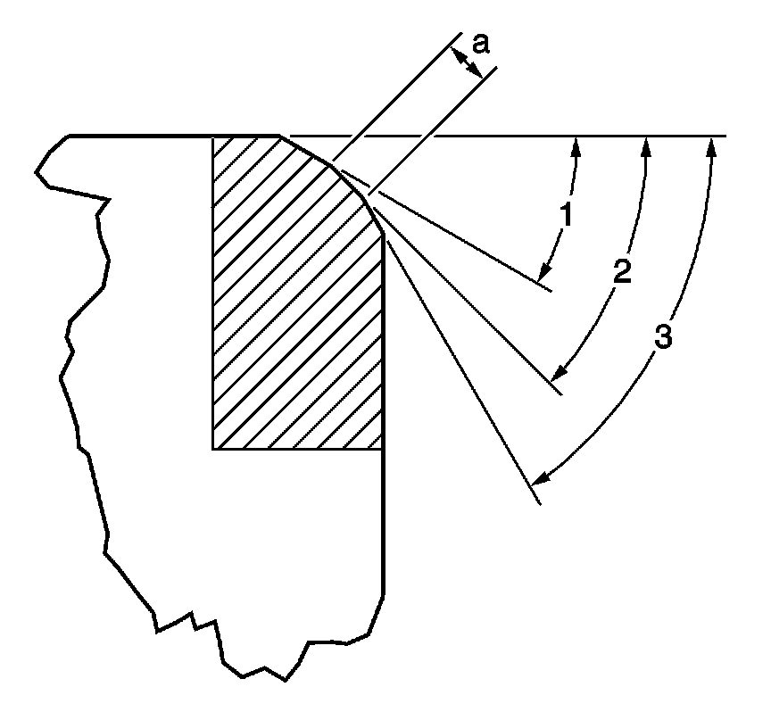 3. Grind the valve undercut surface to the proper angle specification (3) listed in Engine Specifications Mechanical, to narrow the valve seating surface width (a) to the specifications listed in Engine Specifications Mechanical.