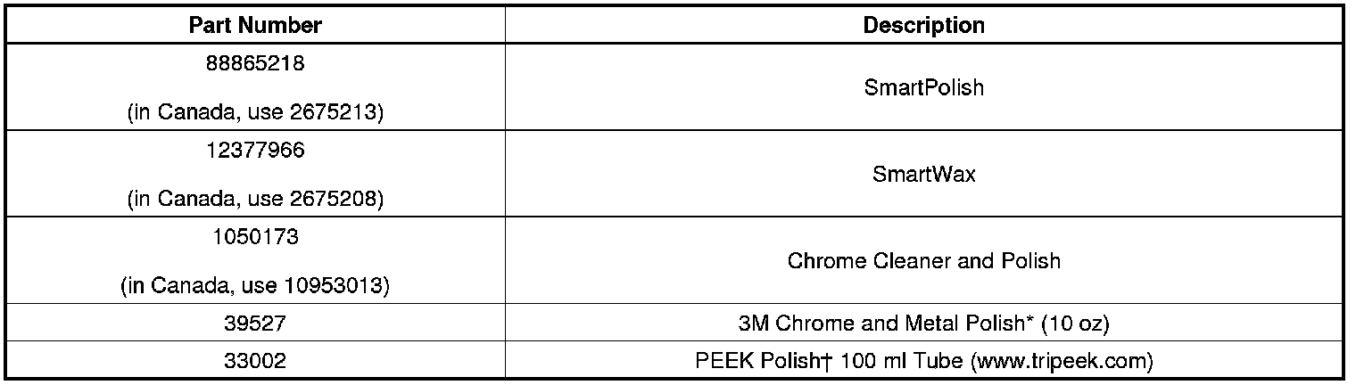 Heavy brake dust build-up should be removed from wheels by using GM Chrome Cleaner and Polish, P/N 1050173 (in Canada use 10953013). For moderate cleaning, light brake dust build-up or water spots use SmartPolish, P/N 88865218 (in Canada, use 2675213). After cleaning, the wheel should be waxed using SmartWax, P/N 88865229 (in Canada, use 2675208), which will help protect the wheel from brake dust and reduce adhesion of any brake dust that gets on the wheel surface. For general maintenance cleaning, PEEK Metal Polish+ may be used. It will clean and shine the chrome and leave behind a wax coating that may help protect the finish.