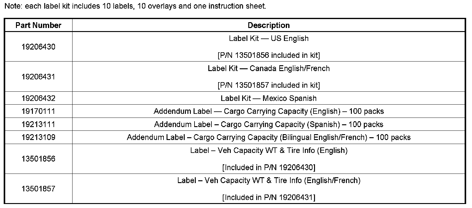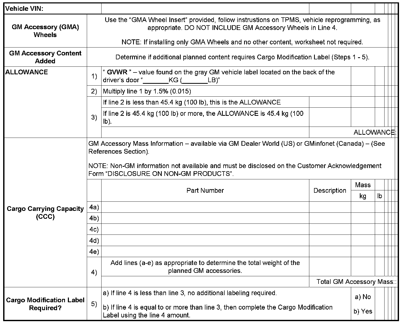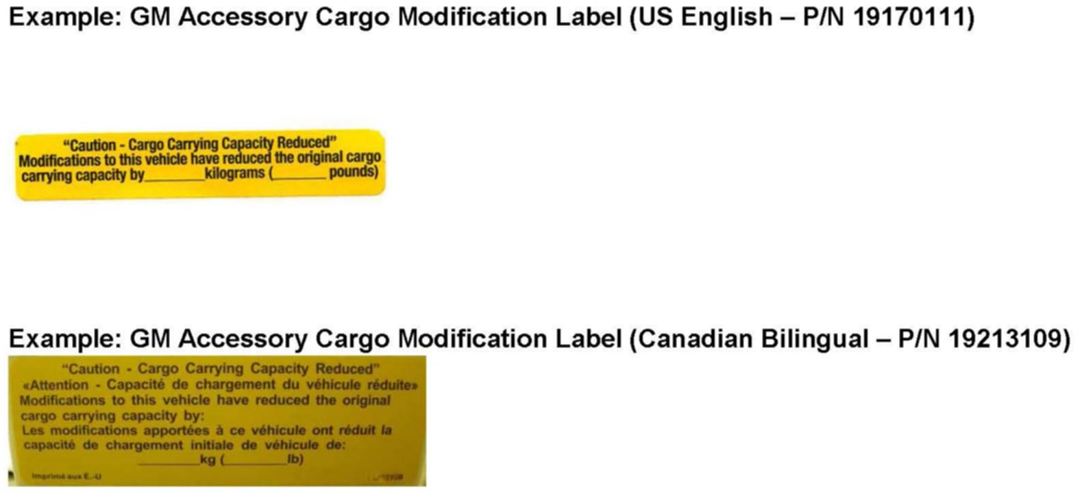 If the combination of GM Accessories is greater than the ALLOWANCE specified above, then the Cargo Modification Label must be utilized (refer to worksheet at the end of this bulletin). This label may be used when adding additional equipment only or may be used along with the above wheel insert.