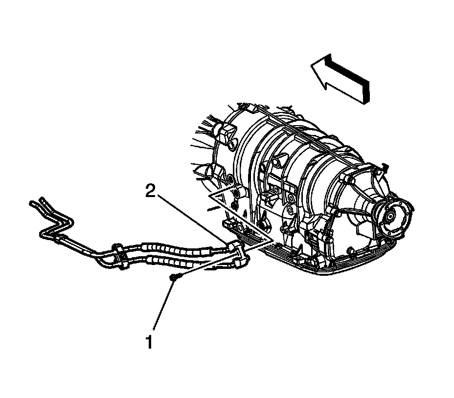 20. Remove the bolt (1) securing the transmission fluid cooler pipes retainer (2) to the transmission.