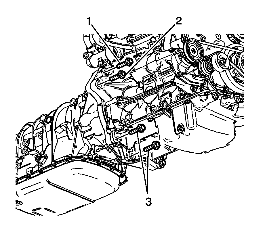 3. Install the right transmission mounting bolts (3) and tighten to 50 Nm (37 lb ft).