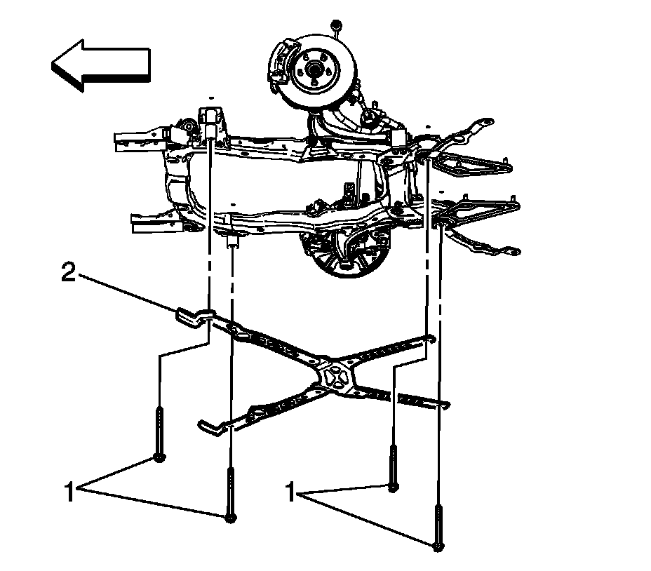 1. Position the support brace (2) on the cradle, for vehicles equipped with the 3.5L (LZ4) or 3.9L (LZ9) engines.
