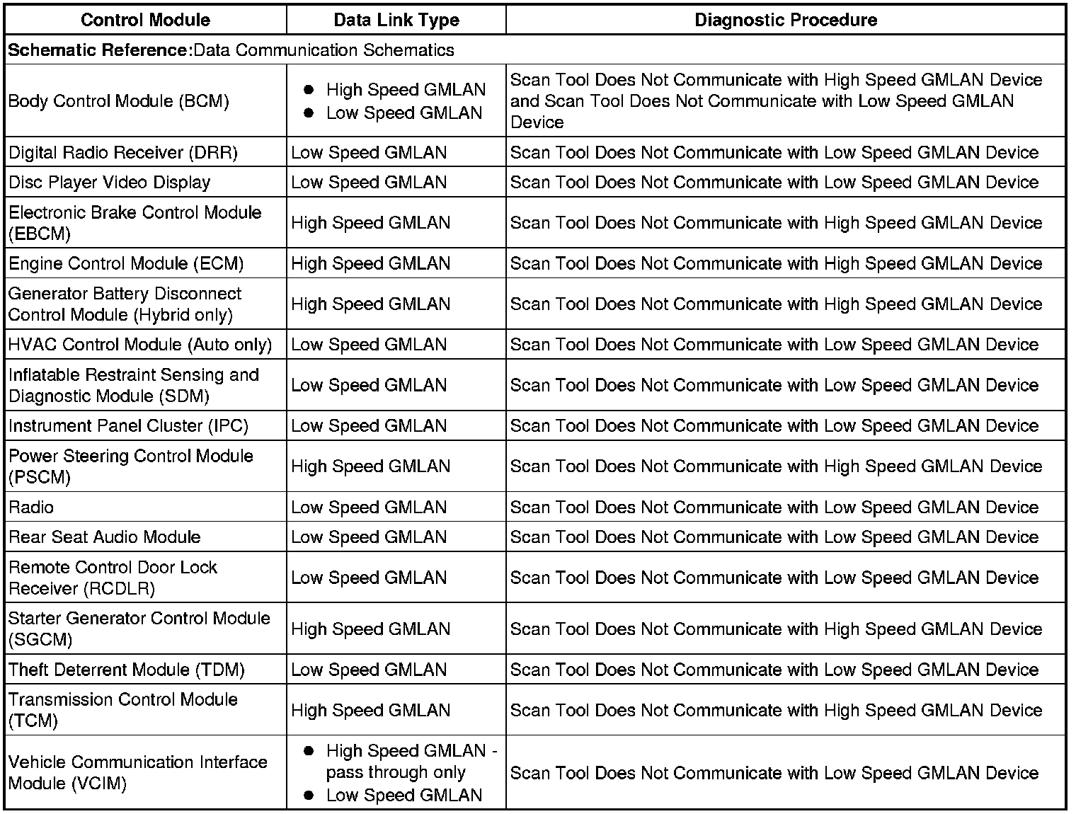 This table identifies which serial data link that a particular module uses for in-vehicle data transmission. Some modules may use more than one data link to communicate. Some modules may have multiple communication circuits passing through them without actively communicating on that data link. This table is used to assist in correcting a communication malfunction. For the description and operation of these serial data communication circuits, refer to Data Link Communications Description and Operation Description and Operation.