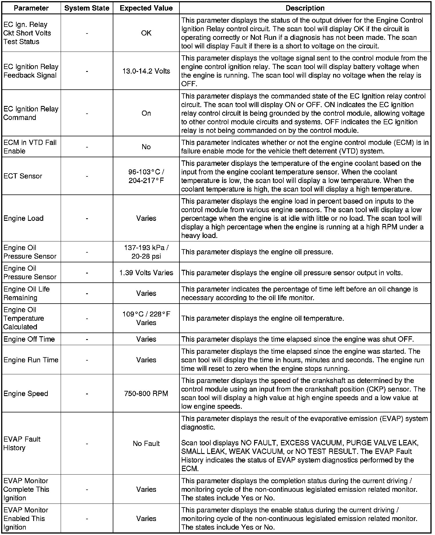 The Engine Control Module Scan Tool Data List contains all engine-related parameters that are available on the scan tool. The list is arranged in alphabetical order. A given parameter may appear in any one of the data lists, and in some cases may appear more than once, or in more than one data list in order to group certain related parameters together.