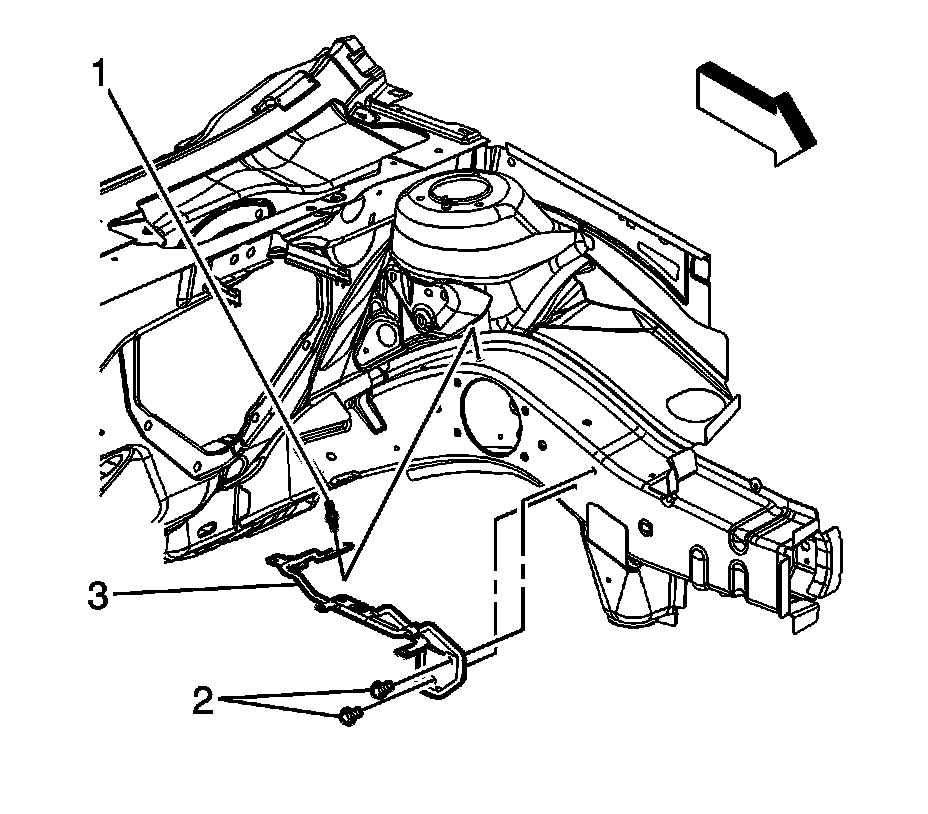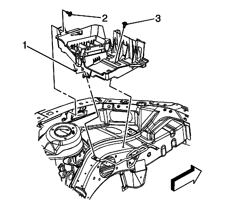 2. Remove the battery tray bolts (2, 3) and nut (1).