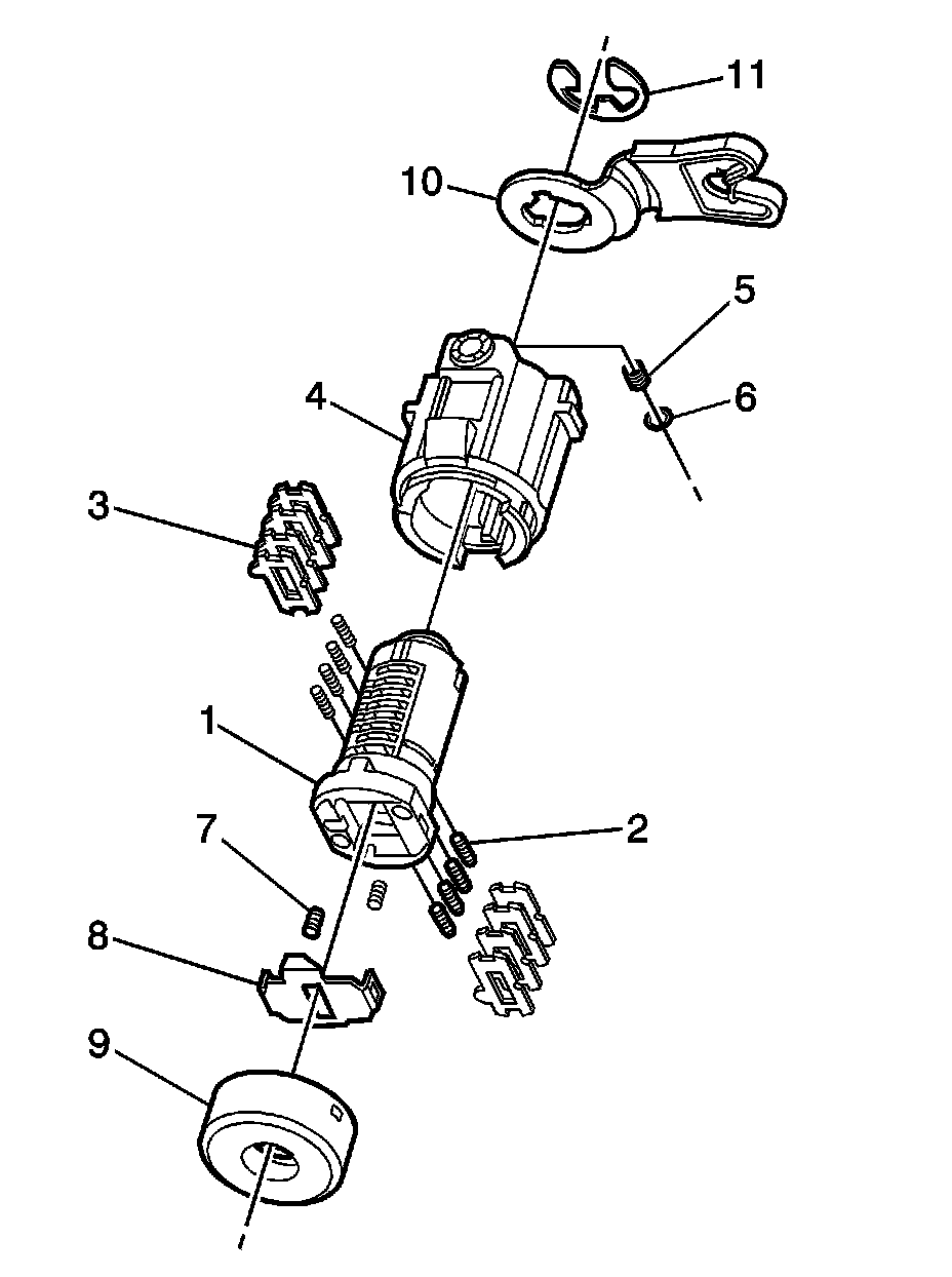 Note: The ignition lock cylinder tumblers (3) are not self-retaining and must be held in place if the key is not fully inserted into the lock cylinder or until the cylinder (1) is assembled into the case assembly (6).
