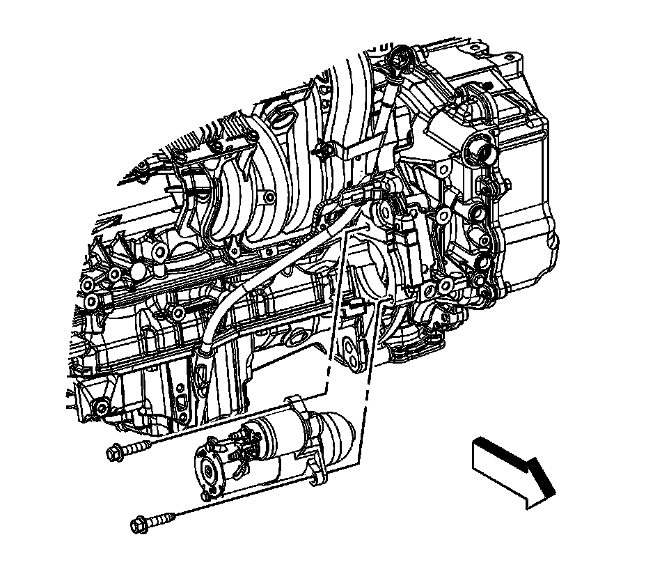 2. Install the starter motor bolts and tighten to 40 Nm (30 lb ft).