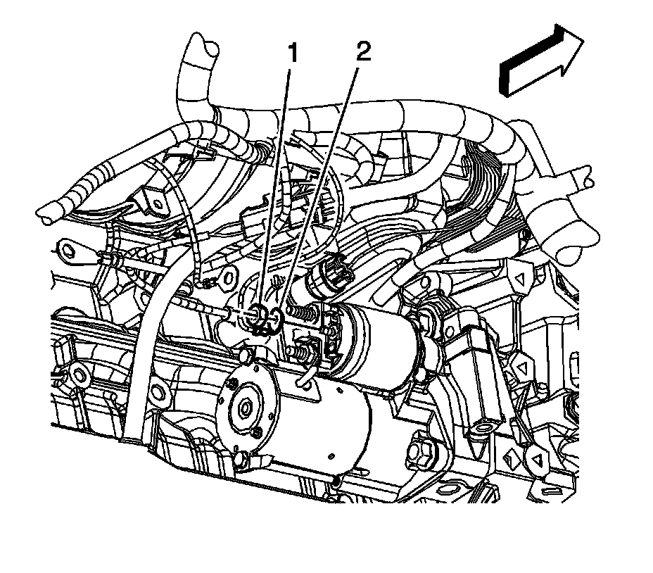 5. Remove the positive battery cable nut (2) from the starter solenoid.