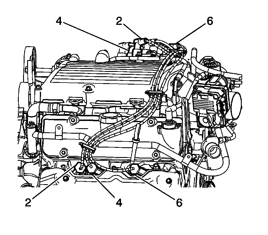 5. Install the spark plug wires (2, 4, and 6) to the engine left side spark plugs.