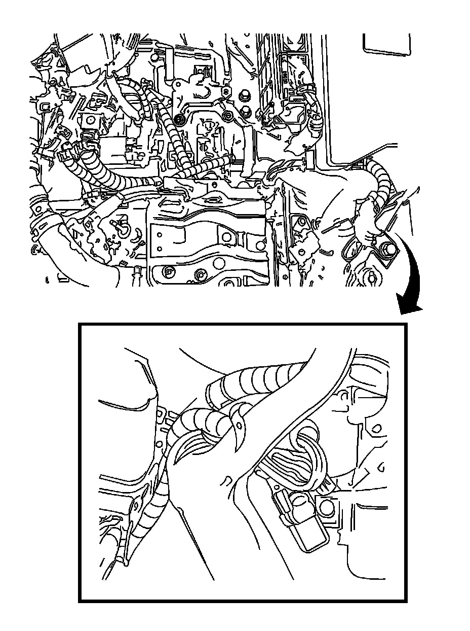 5. Route the engine block heater harness rearward and behind the air inlet. Bring harness upward along the air inlet.