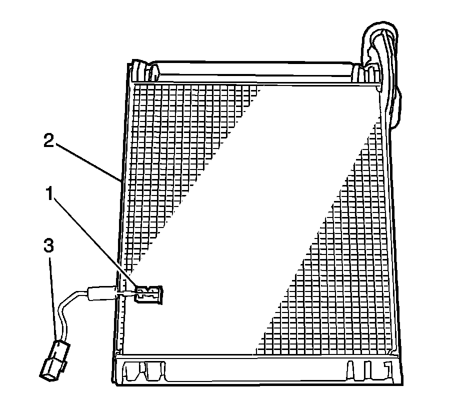 3. Remove the evaporator temperature sensor (1) from the evaporator core (2).