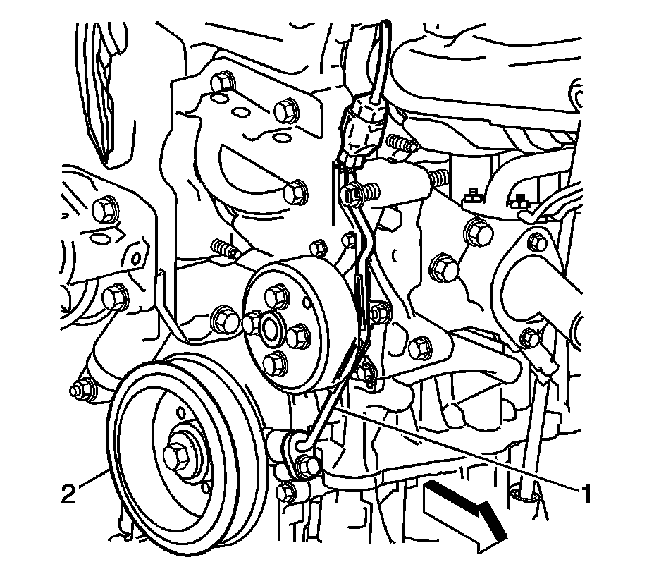 The crankshaft position (CKP) sensor (1) is located in the front cover of the cylinder block near the crankshaft pulley (2). The CKP sensor produces an AC signal that increases in both frequency and amplitude as the engine speed increases. The CKP sensor signal is sent to the PCM in order to indicate the RPM and the crankshaft position. The PCM uses the CKP sensor signal along with the camshaft position (CMP) sensor signal for the following purposes: