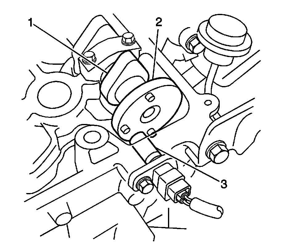 The knock sensor (KS) (1) is located below the intake manifold (2), on the engine block between cylinder 2 and cylinder 3. The KS detects engine detonation and sends a signal to the PCM. The PCM uses the input from the KS to adjust the ignition timing in order to control detonation. For detailed information on the operation of the KS refer to Knock Sensor System Description (Description and Operation).
