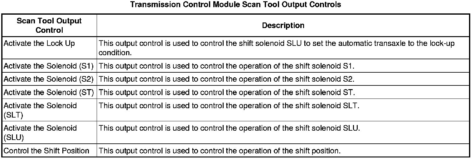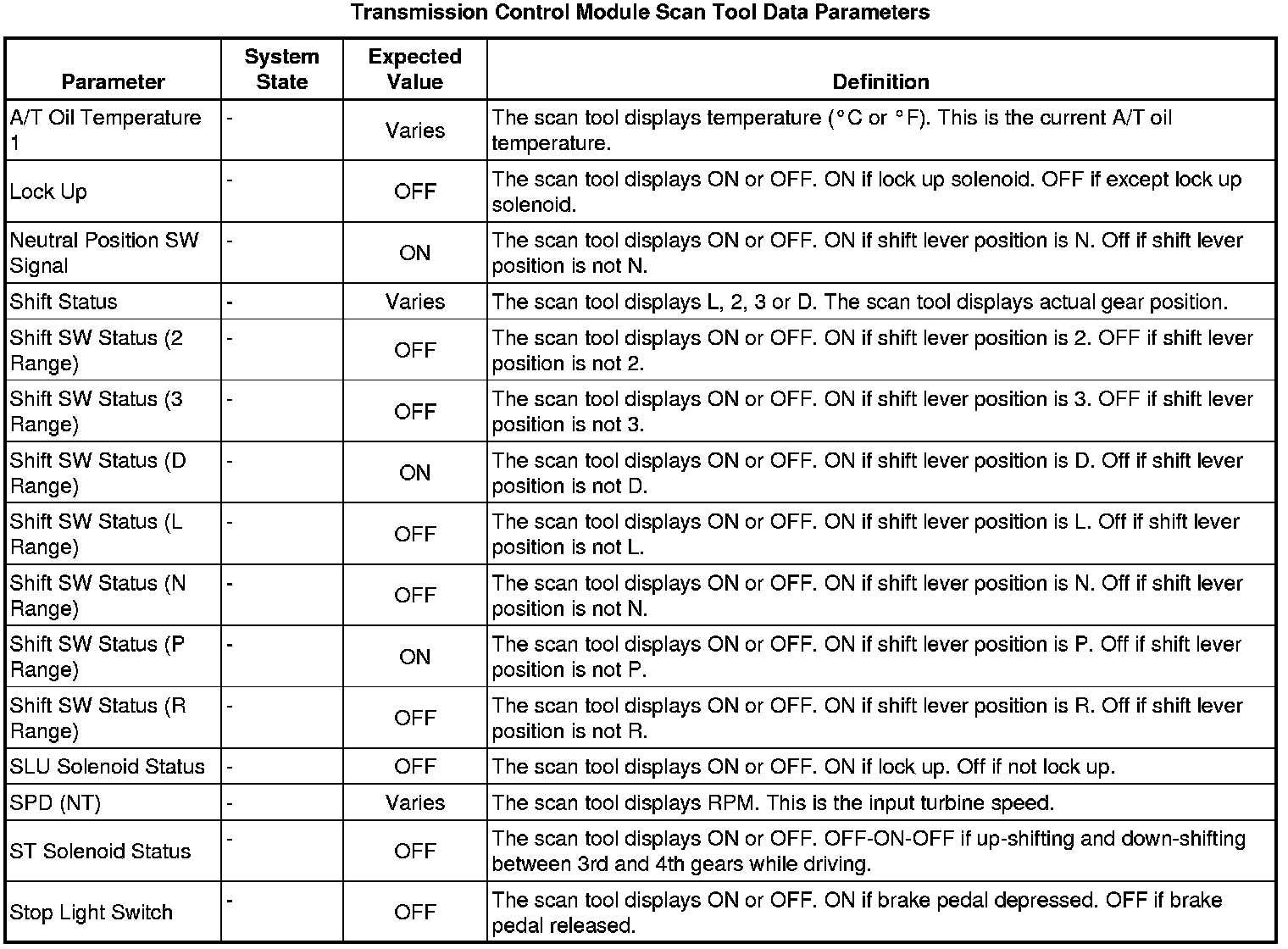 The Transmission Control Module Scan Tool Data List contains all transmission related parameters that are available on the scan tool. The list is arranged in alphabetical order. A given parameter may appear in any one of the data lists, and in some cases may appear more than once, or in more than one data list in order to group certain related parameters together.