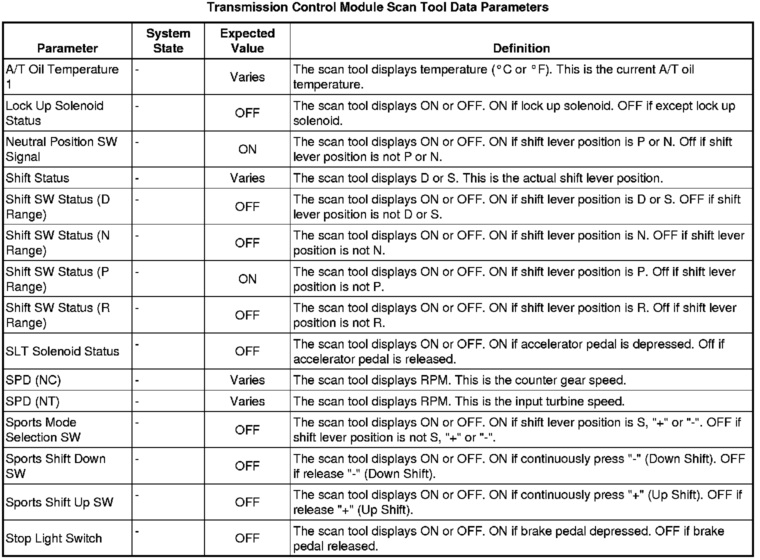 The Transmission Control Module Scan Tool Data List contains all transmission related parameters that are available on the scan tool. The list is arranged in alphabetical order. A given parameter may appear in any one of the data lists, and in some cases may appear more than once, or in more than one data list in order to group certain related parameters together.