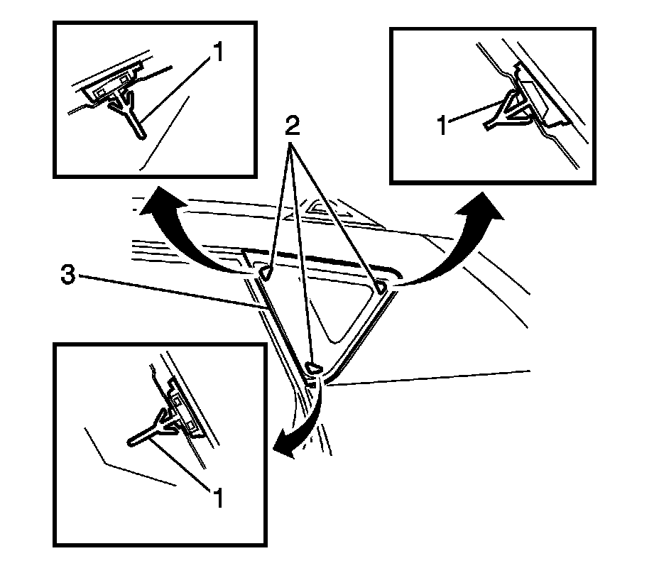 4. Gently unseat the quarter window retainer-male ends (1) on the window (3) from the quarter window retainer-female ends (2) on the body.