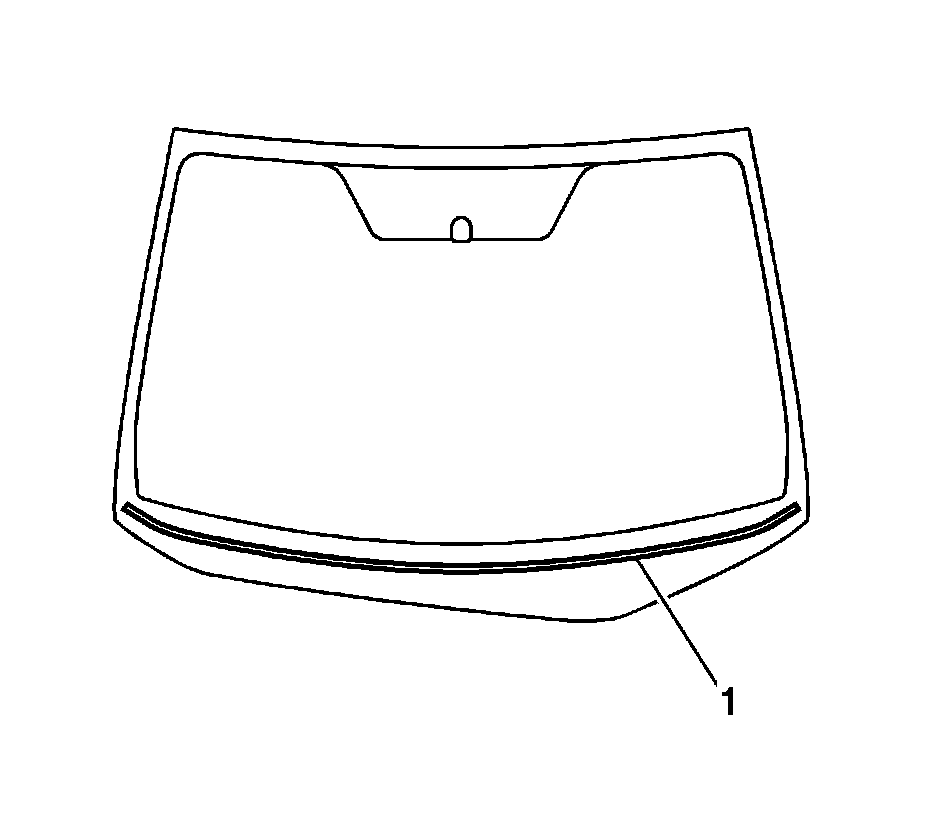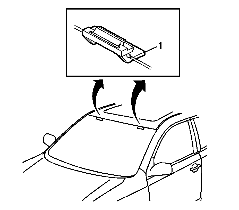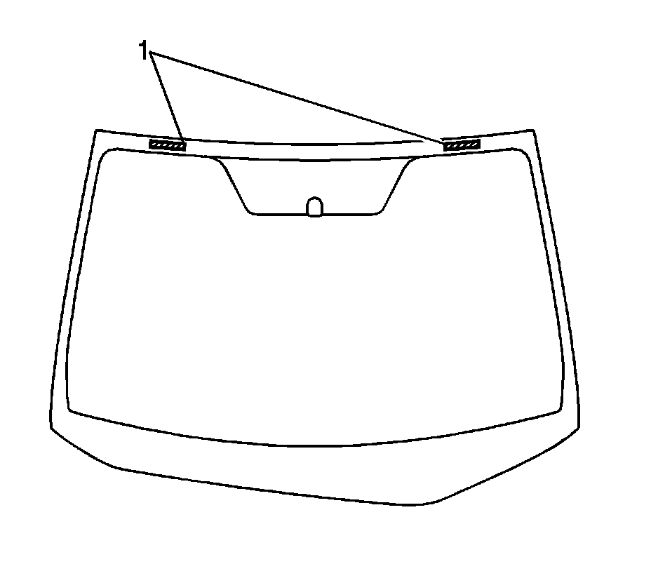 2. Remove the windshield inside garnish moldings (1) from the vehicle. Refer to Windshield Pillar Garnish Molding Replacement (Without Roof Side Rail Restraint) (Windshield Pillar Garnish Molding Replacement (Without Roof Side Rail Restraint))Windshield Pillar Garnish Molding Replacement (With Roof Side Rail Restraint) (Windshield Pillar Garnish Molding Replacement (With Roof Side Rail Restraint)).