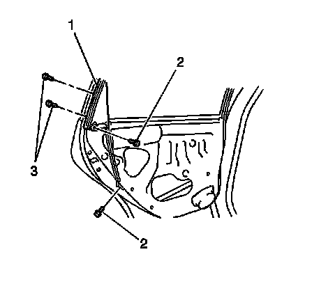 1. Install the window guide channel (1) to the rear door. Secure the guide channel with the 2 bolts (2) and the 2 screws (3). Tighten the window guide channel bolts to 8 Nm (71 lb in).