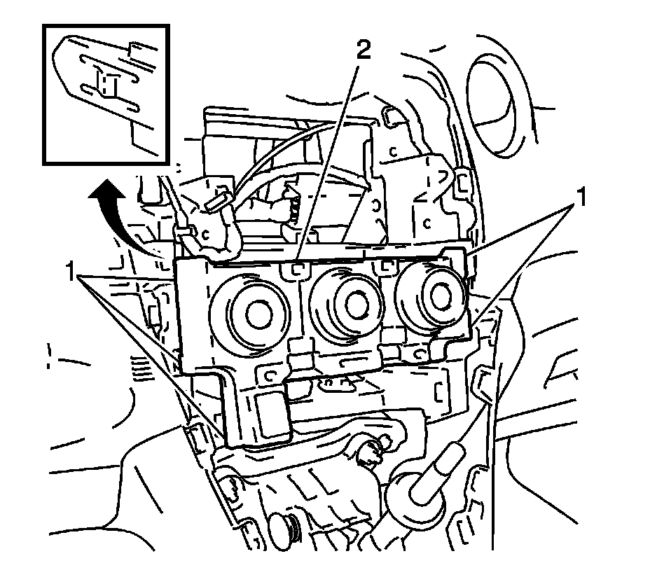 3. Disengage the five retainers (1) from the HVAC control unit (2).