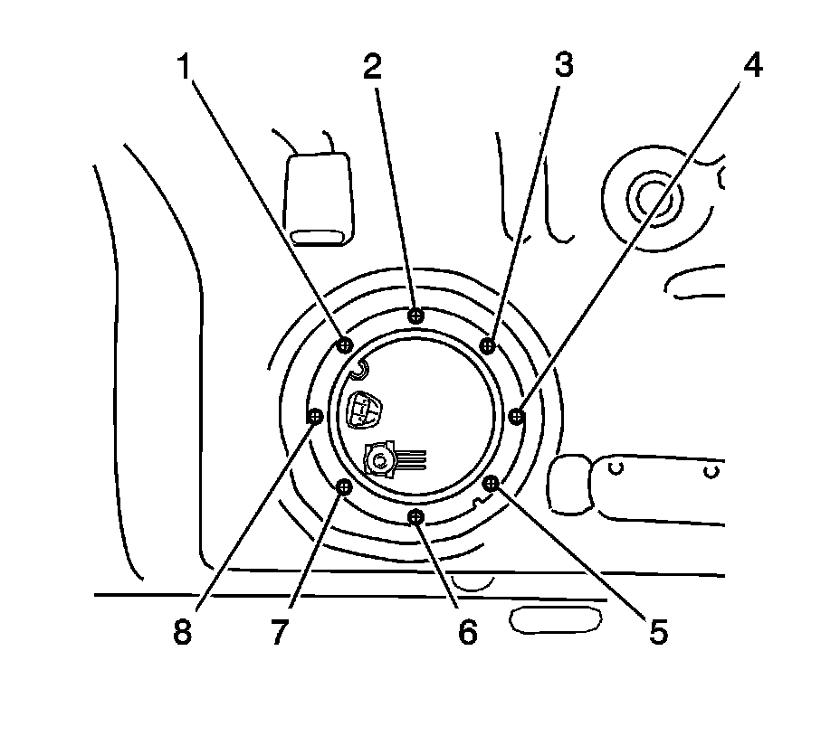 11. Remove the 8 bolts (1-8) and the fuel pump gage retainer for AWD.