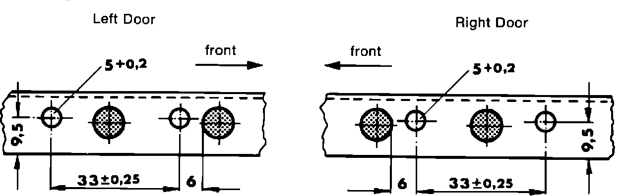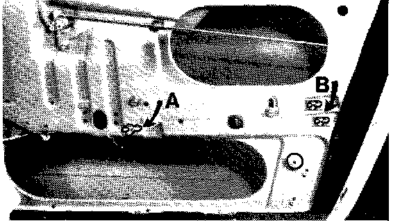 5. Pull off both snap nuts. Mark location of holes (see sketch). Center punch and drill holes 5 + 0.2 mm. (Some 85 model cars already have these holes).