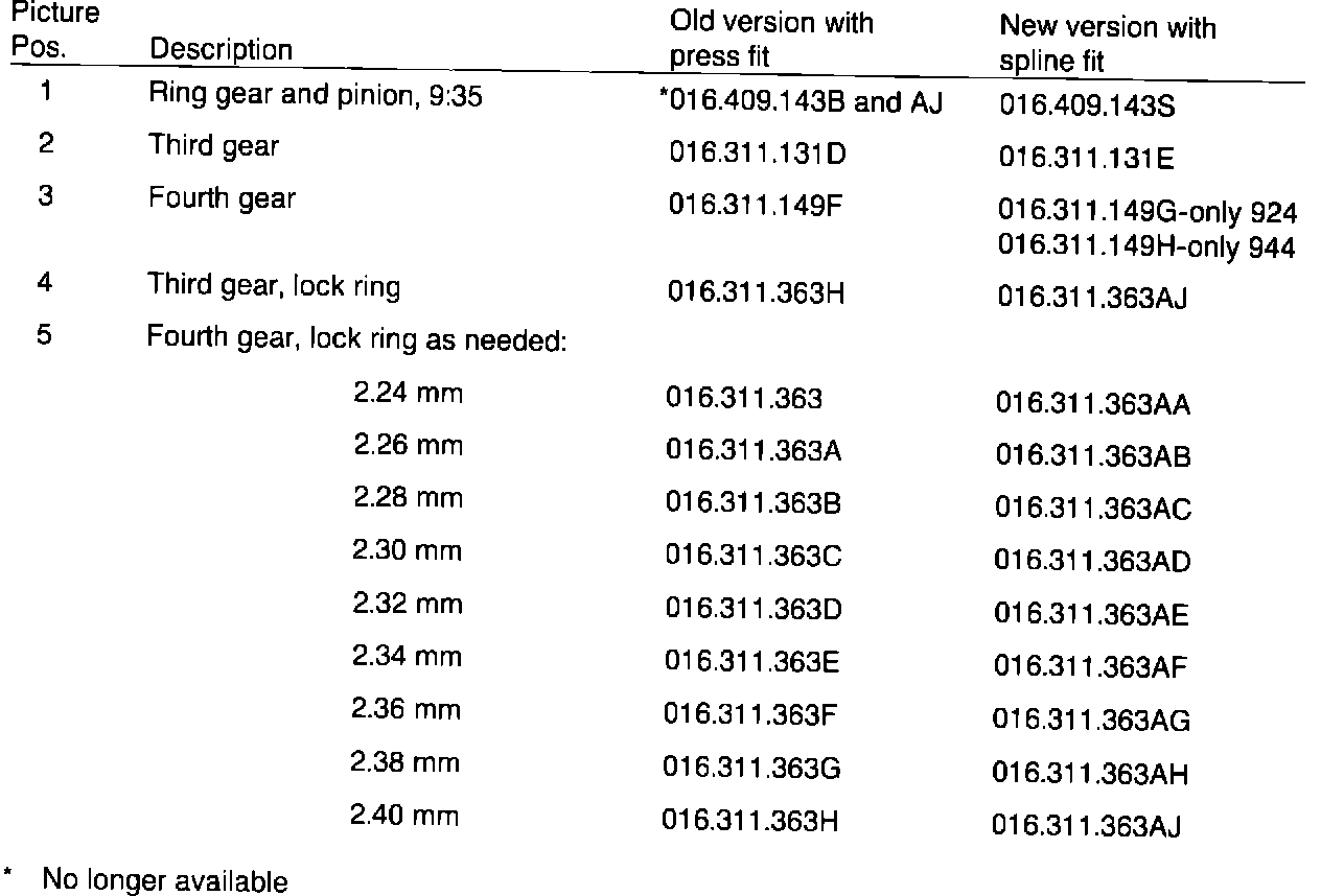 Up to and including M.Y. '83, the ring gear and pinion set, Part No. 016.409.143B and AJ was installed. This part is no longer available. On this pinion, the 3rd and 4th gear had a press fit.