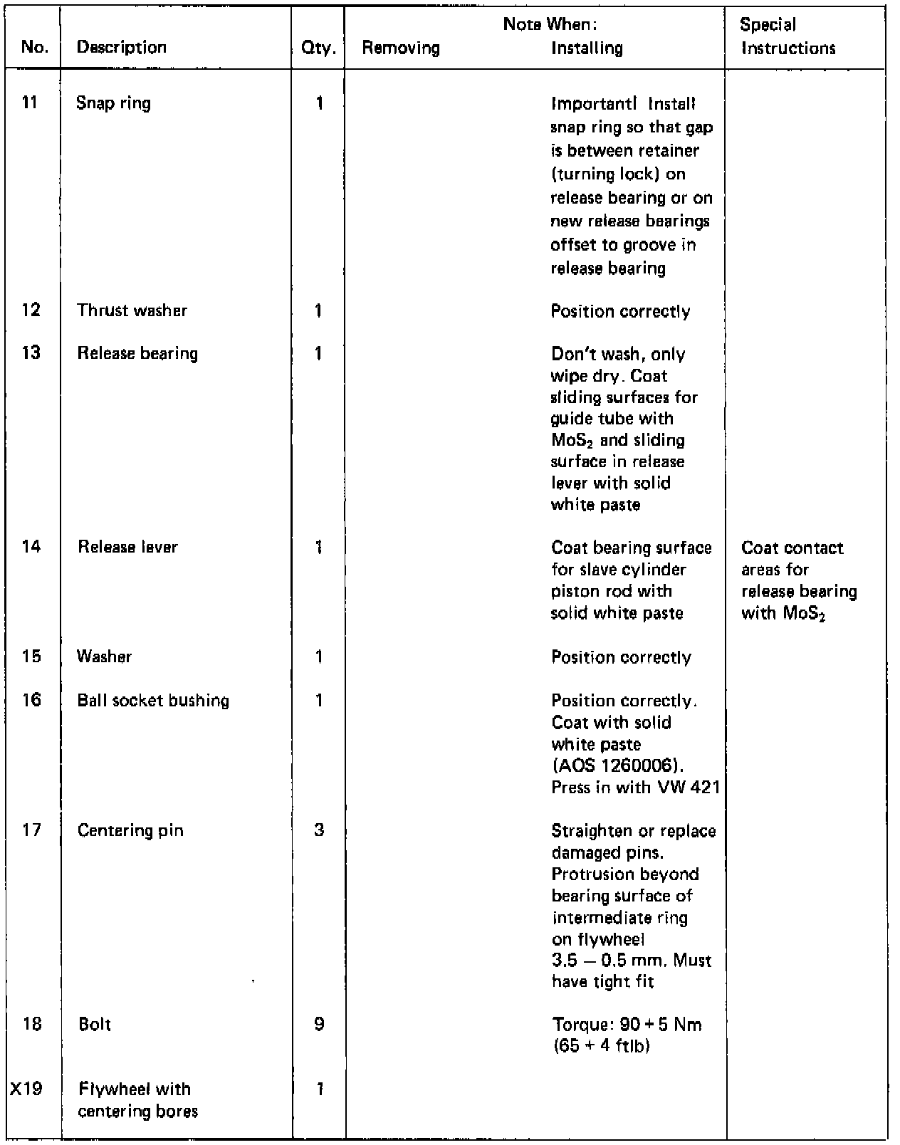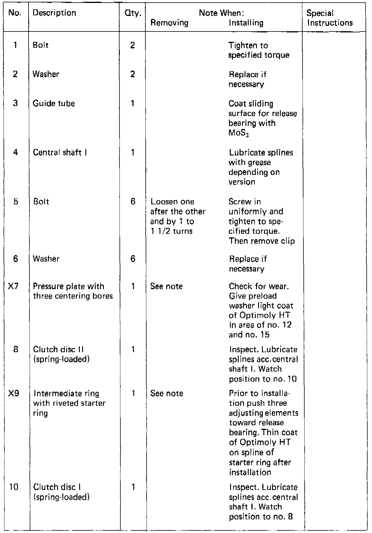 Parts in table marked with "X" were balanced together in manufacturing and must therefore be marked prior to removing for installation in same position later (also refer to procedures).