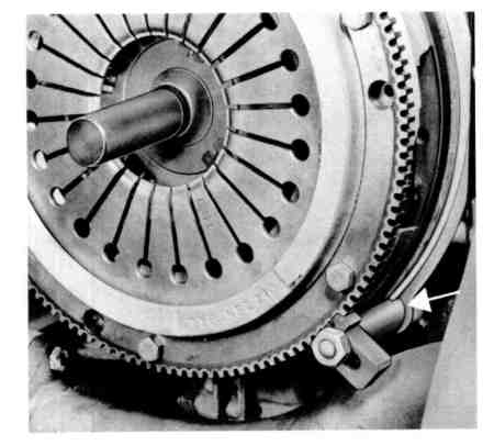 - Tighten bolts evenly and diagonally to prevent distortion on cover. Tighten bolts to specified torque. Use Special Tool P 201 a and a spacing sleeve to hold the flywheel.