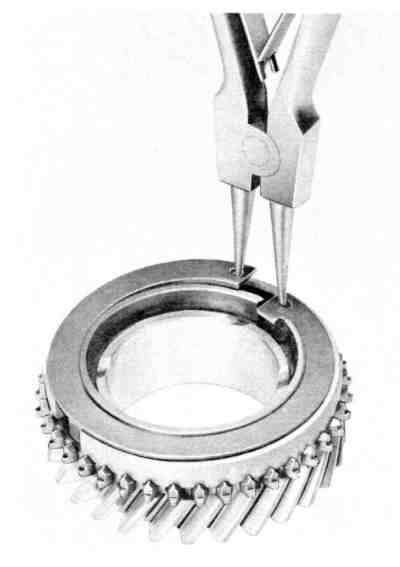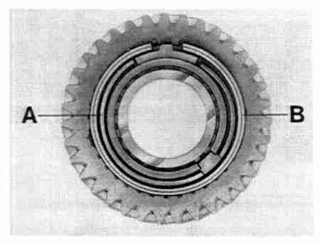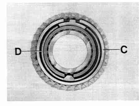 NOTE: A coat of molybdenum is sprayed on the rough surface of a synchronizer ring. Different loads are applied to both sides of a synchronizer ring during a shift. Consequently when repairing, the synchronizer ring should always be turned so that the rough side faces the operating sleeve.