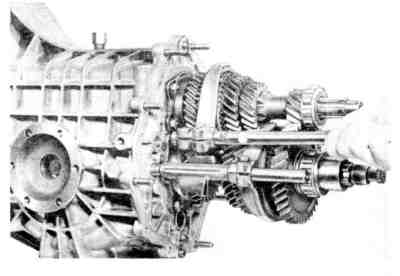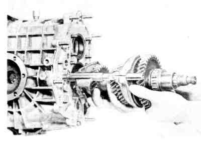 - Insert pinion shaft with 1st and 2nd speed selector fork so that the pinion comes barely to rest in the bearing race of the transmission housing.