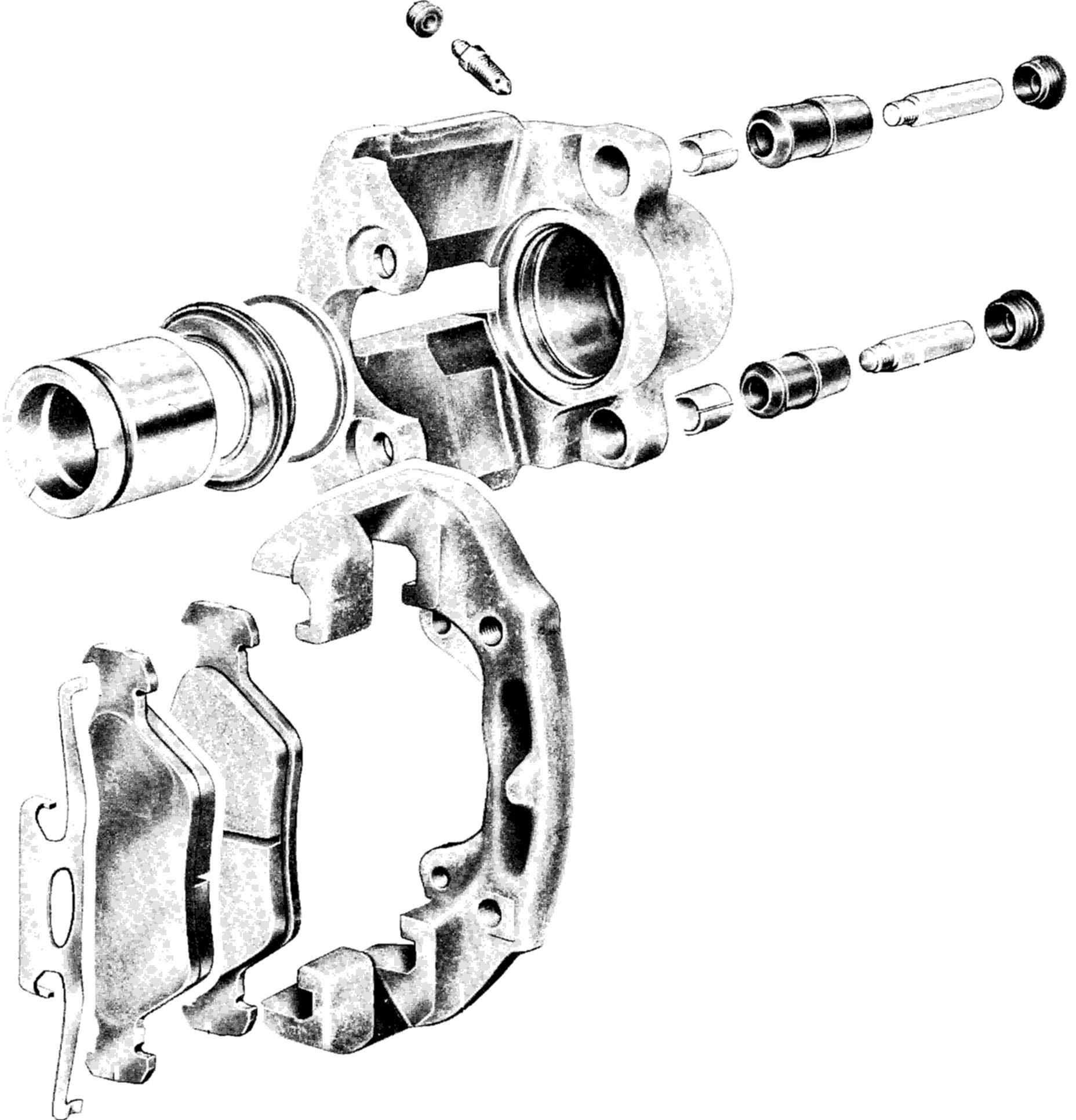 14. Bolt holder to housing. Tighten guide pins to specified torque. Insert brake pads and housing retaining springs.