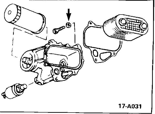 To prevent oil or coolant leakage from the oil cooler housing area, the tightening torque of the 4 mounting bolts was increased as of November 29, 1983; engine numbers 43 E 04711 - 5 speed trans 43 E 20613 - Automatic trans
