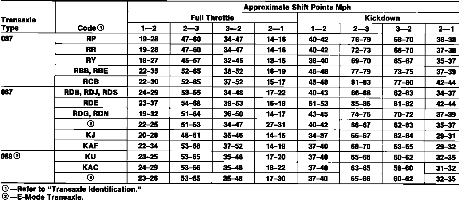 Drive vehicle in all gear ranges and under all possible road conditions. Do not road test if there is obvious mechanical damage. Observe shift points and compare to table in Fig. 2. Shifts should be smooth and quick without a lag in power. Listen for engine speed up between shifts which could indicate slipping brake bands or clutches. Inspect for fluid leaks after road test. If transaxle performance is not acceptable, refer to ``Troubleshooting'' to determine possible causes for malfunction.