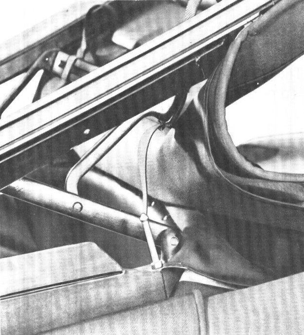 TOP SECURITYTo ensure that the top is properly seated when stowed, the retaining lugs on the B-pillars must be precisely adjusted and engagement assured. In this way the strain on the pressstuds on the tonneau cover does not become excessive and chafe marks on the covers are avoided.
