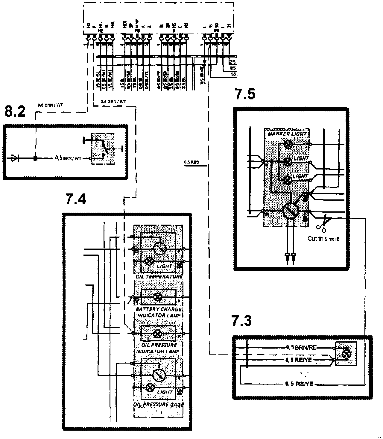 7.4 - Pull the additional green / white wire through the flat connector housing (999 652 199 40) and crimp the flat male connector (N 017 242 11) onto the end of the wire. Insert the flat connector into the flat connector housing. Connect the additional green / white wire onto terminal G of the oil pressure / oil temperature gauge (see wiring Diagram 7.4).
