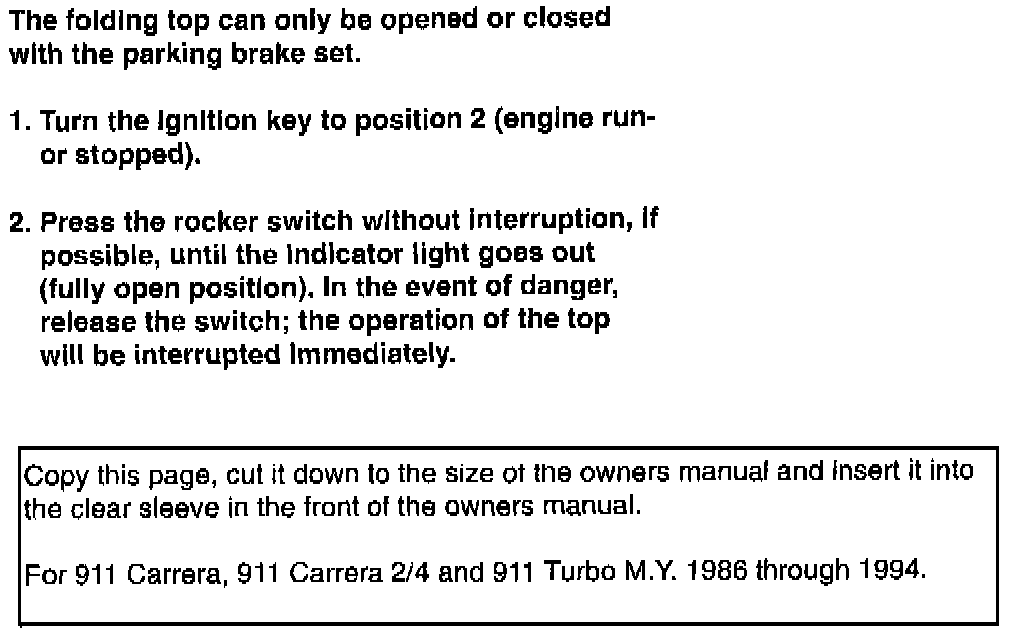 11 - Ensure that the vehicle owner is aware of the change in operating instructions for the Cabrio top.The changed operating instructions for the owner's manual are found in this bulletin. Copy the page, cut it down to the size of the owner's manual, and insert it into the clear sleeve in the front of the owner's manual.