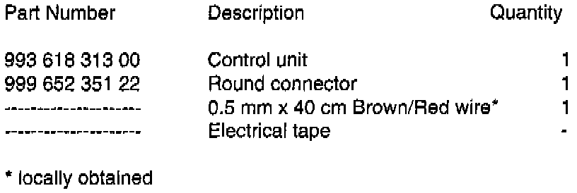 The additional parts will be required when installing the 993 618 313 00 control unit into the 911 Carrera 2/4 or 911 Turbo MY. 1990 through 1994: