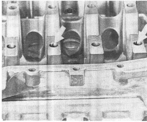 Apply air pressure in oil feed bore for main bearings and observe ejection pattern of spray valve.