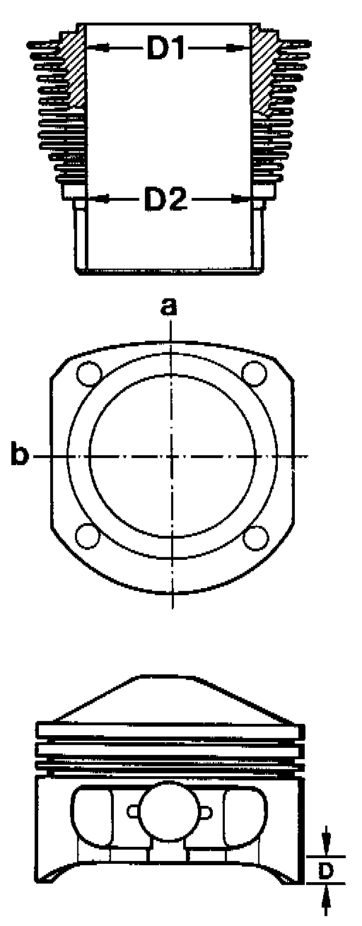 The cylinder is worn when the diameter at this measuring point exceeds the original diameter by 0.08 mm. The ovality of the cylinder is measured by comparing axes a and b. The difference between a and b must not exceed 0.04 mm.