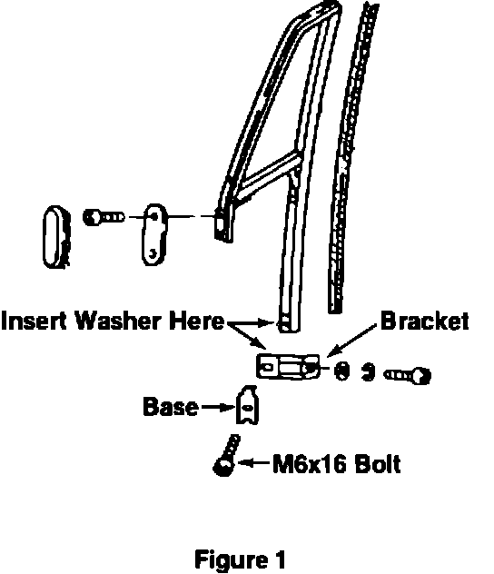 When repairing the window frame or replacing the lower bracket due to breakage on vehicles produced before November 5, 1992 production, a washer (Part Number N 011 672 3) must be placed between the window frame and bracket. A 4 mm longer bolt and stronger base is also used in conjunction with the washer (see Figure 1). The bracket, which retains the frame to the door, remains unchanged.