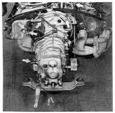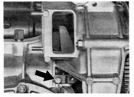 - Disconnect transmission by removing the 4 securing nuts. Use Special Tool P 119 for the upper securing nut at starter.