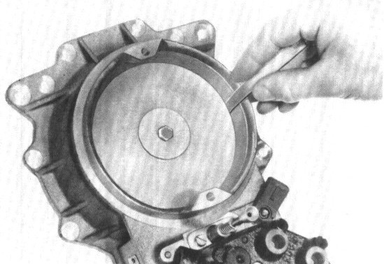 6. Align angular clearance between air flow sensor plate and venturi. The angular clearance must be uniform. It can be checked with a 0.10 mm feeler gauge. This requires that height adjustment (off position) of air flow sensor plate be correct.