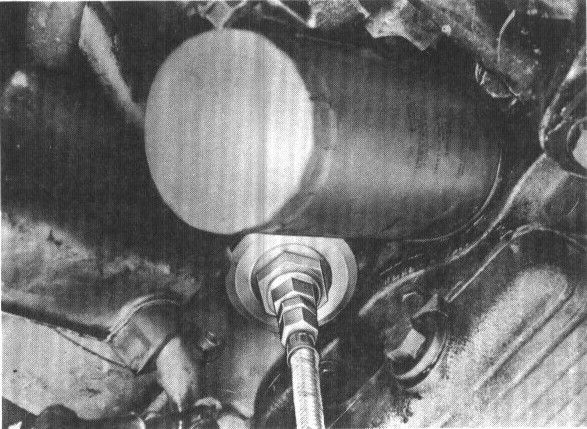 3. Screw oil pressure tester VW 1342 in conjunction with M 10 x 1 adapter, Part No. 999.105.013.02, and M 10 x 1 / M 18 x 1.5 adapter, Part No.901.101.175.01, in plug opening for oil thermostat housing in place of the oil pressure sensor. Mount oil filter and add oil.